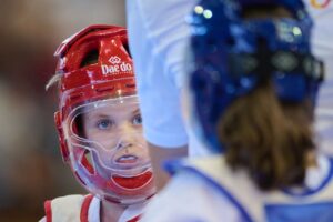Minutos después, el ambiente se tornó más distendido y entrañable cuando los hijos de Patricia se animaron a calzarse el peto y el casco para vivir el taekwondo desde dentro. Guiados por el técnico Alejandro Del Val, recibieron una rápida clase sobre las reglas básicas del taekwondo y protagonizaron un combate recreativo que despertó sonrisas y aplausos. Una acción con espíritu familiar que refleja el valor de acercar nuestro deporte a quienes lo apoyan, dentro y fuera del tatami.